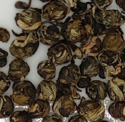 Es un Té Verde de hojas jóvenes. Las plantas son cosechadas a mano en primavera, se dejan almacenar las hojas ya convertidas en té verde, hasta verano cuando las flores de jazmín abren, por las noches se expone el té a las flores por cuatro horas cada noche por diez noches hasta obtener el aroma deseado. Y se finaliza el proceso con el secado. Se enrulan a mano en forma de perlas. El resultado es un aroma de jazmín intenso y persistente con una base de té dulce y suave.
