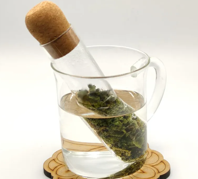 Infusor de vidrio en forma de tubo de ensayo con cuchara medidora de madera. Prepara la taza perfecta con este infusor.